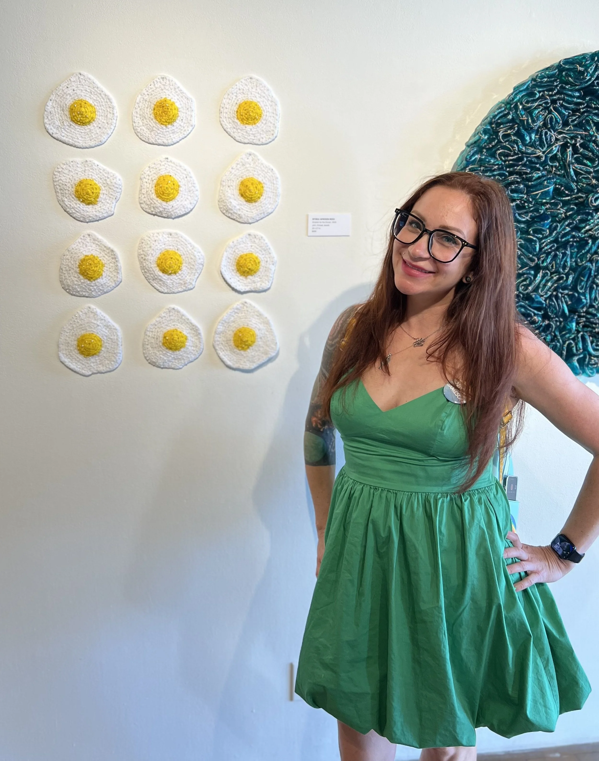 Nyoka Jameson is a mixed media artist based in Bakersfield, California. Her work spans painting, fiber, and sculpture, often combining materials that carry contrasting cultural and gendered associations, including watercolor, ink, crochet, welding, and found or industrial elements. Through these material juxtapositions, her practice explores themes of femininity, power, intimacy, and contemporary social and political issues.